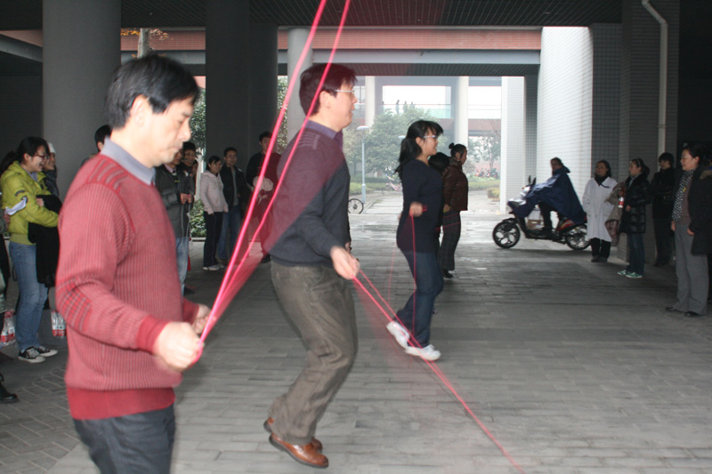 初冬的午后,细雨夹着微微的凉意,但在紫金港医学部综合楼前广场上却是一番热火朝天的景象。2011年12月20日中午,我部工会健身月活动系列活动之一---趣味跳绳比赛正在紧张地进行着。医学部党委副书记、工会主席吴弘萍宣布比赛正式开始,来自药学院、基础医学系、公共卫生系和学部机关共8支参赛队伍开始了这一场精彩地角逐。趣味跳绳比赛设单人跳、男女双人跳和集体跳(五人组合)等项目,最终以规定时间内次数多少决定名次。