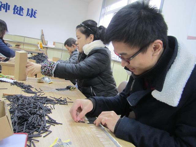 大厅里,约莫二十位花甲老人安静地做着手边的工作——电阻组装。见到志愿者们,很开心也很熟稔地打起招呼“嗨,今天给我们带来了什么节目啊?”一边招呼着大家做到老人们的身边。老人们活泼开朗、热情好客的态度很快使初初到来的志愿者们加入了畅聊和帮忙的行列。此外,志愿者们也应老人们的要求,充分发挥自己的才艺,唱歌、朗诵,无所不有。老人们还说希望下次能有话剧和小品表演……老人们也很愿意展示自己的才艺。一位年逾古稀的老奶奶是公认的才女,不仅仅为志愿者们朗诵了自己作的诗《送别》,还为大家唱起了越剧,场面和谐欢乐。