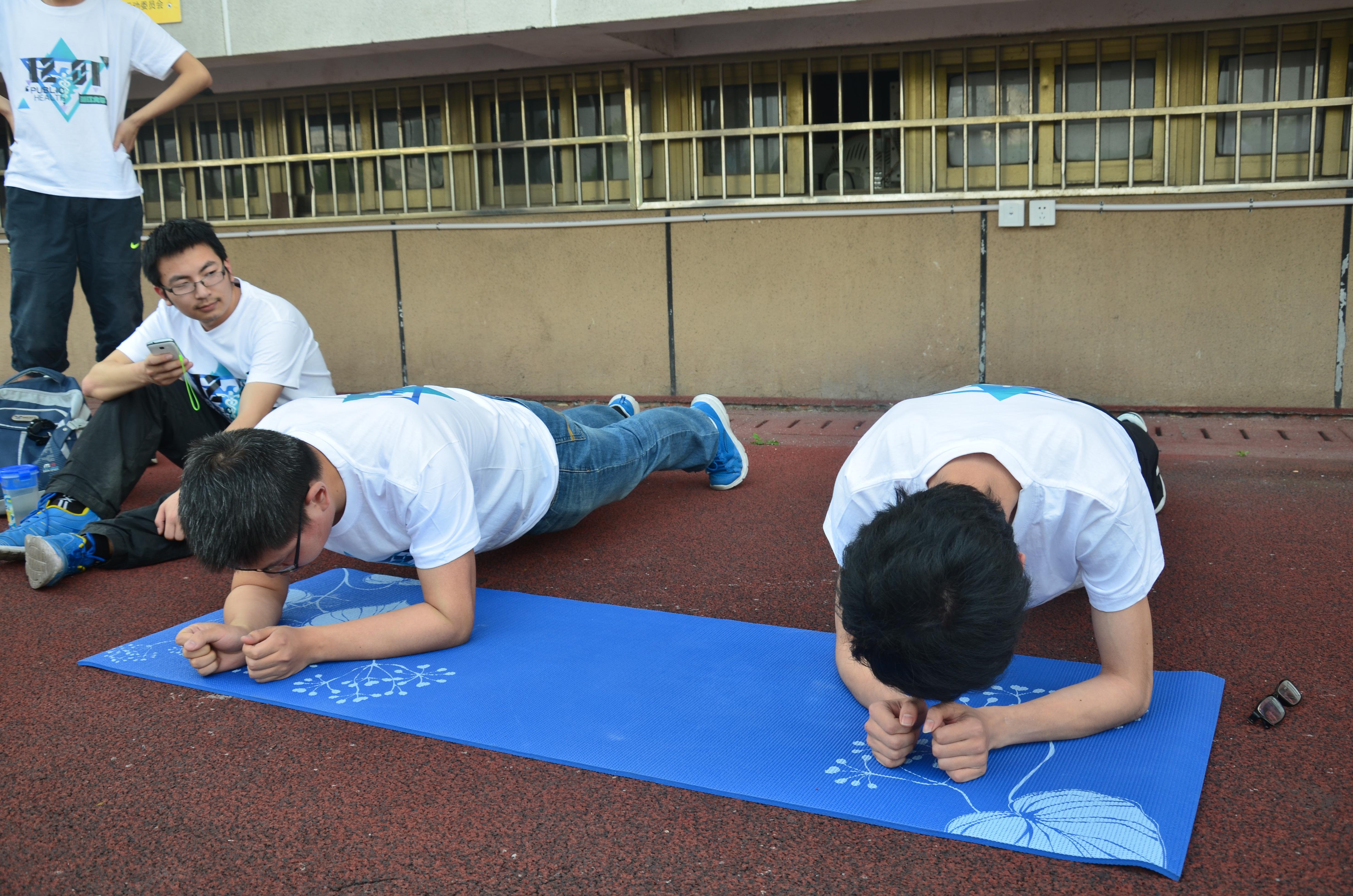 接下来是“平板支撑”,仅以肘关节和两脚支撑身体,支撑过程中保持身体呈一条直线,手脚不得有移动,累计支撑时间长的队伍获胜。这个项目则是考验个人实力,大家跃跃欲试,都想打破前面同学的纪录,但是经常在旁边另类的“鼓励”下,在力竭之前就笑趴在地上。谁让规则没有规定不能从旁干扰呢?