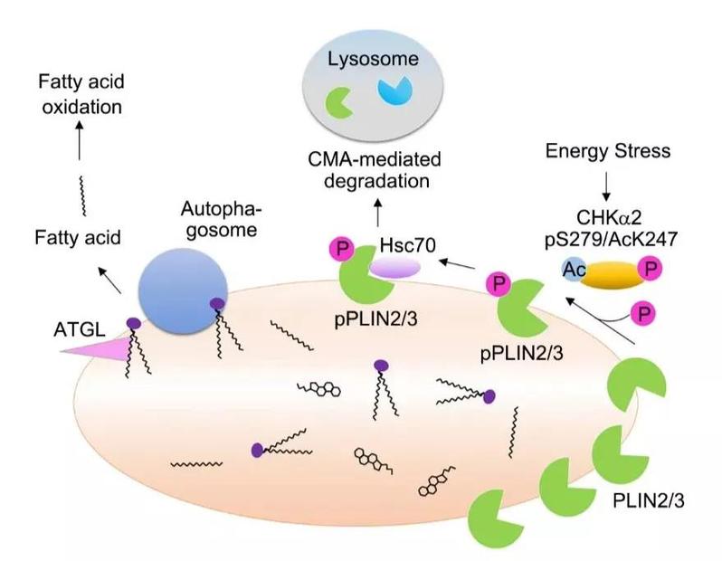 肿瘤细胞能量缺乏时,被AMPK磷酸化和KAT5乙酰化的CHKα2能由细胞浆转位到脂滴表面,同时发挥了蛋白激酶功能,磷酸化脂滴表面蛋白PLIN2/3,从而促进PLIN2/3被分子伴侣HSC70识别,使得PLIN2/3通过自噬途径被降解。失去PLIN2/3蛋白包被的脂滴暴露出内部的脂类分子,被脂类水解酶和自噬体降解,从而促进肿瘤发生发展。